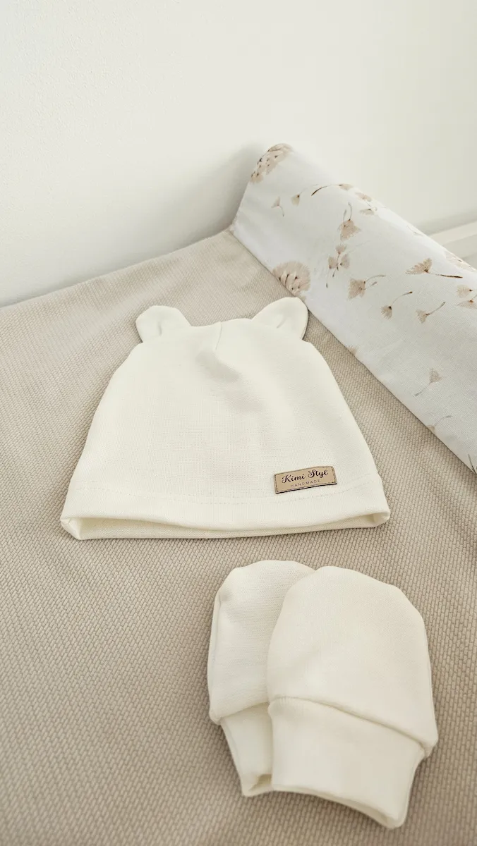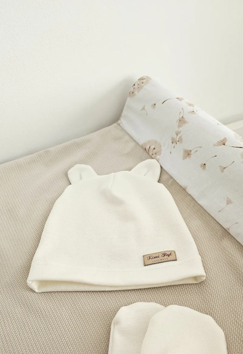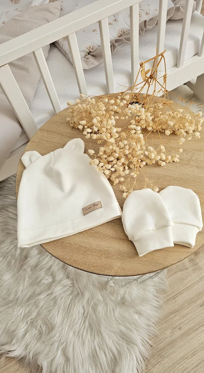 - Czapeczka z uszkami – delikatna czapeczka z bawełnianej dzianiny, doskonała dla noworodka, przydatna już w szpitalu.