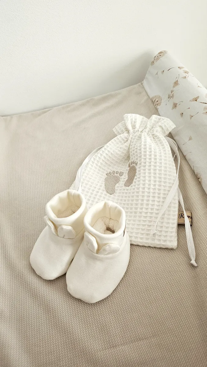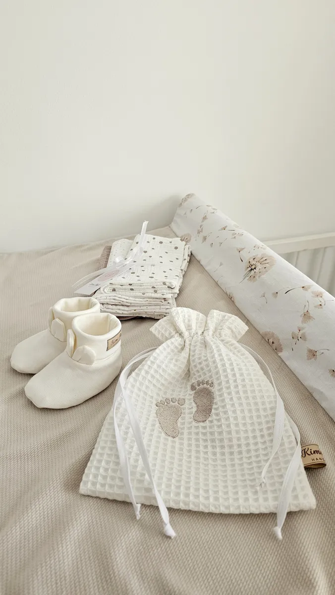 - Woreczek z bawełny wafelkowej ze stópkami – praktyczny organizer na buciki, pieluszki lub inne drobiazgi.