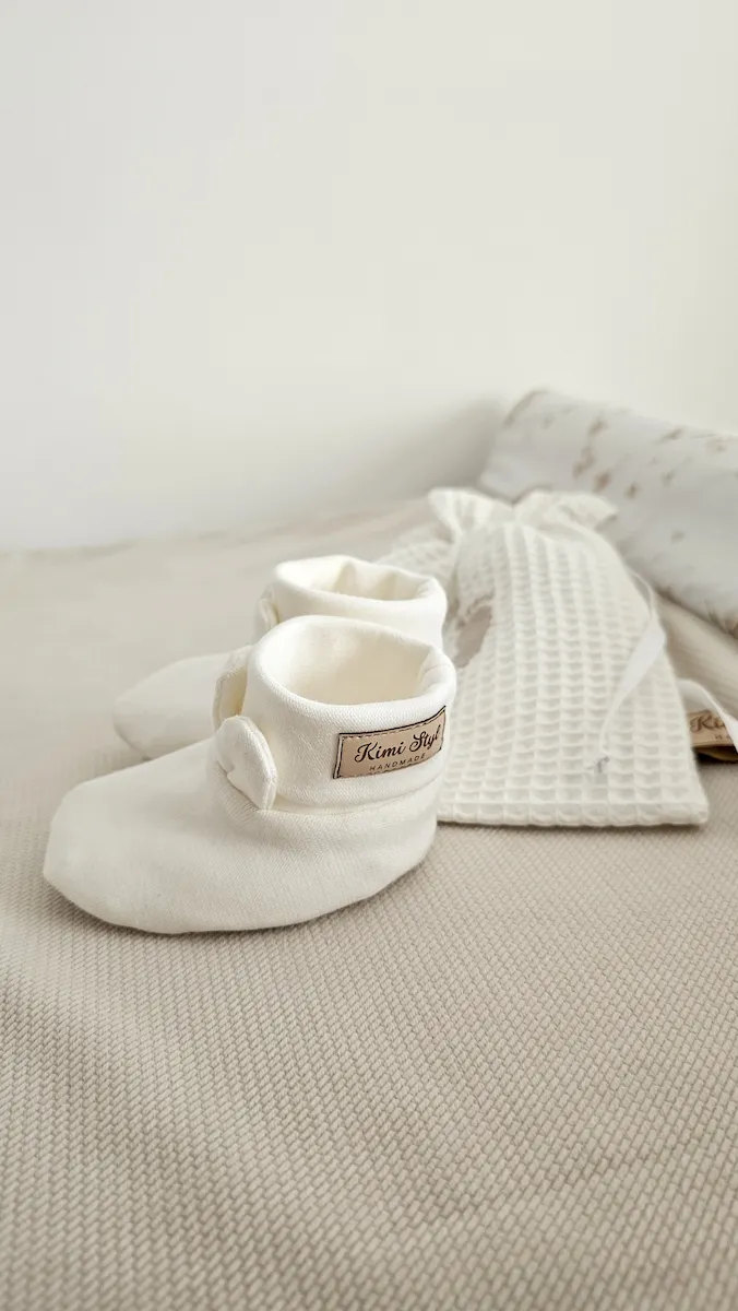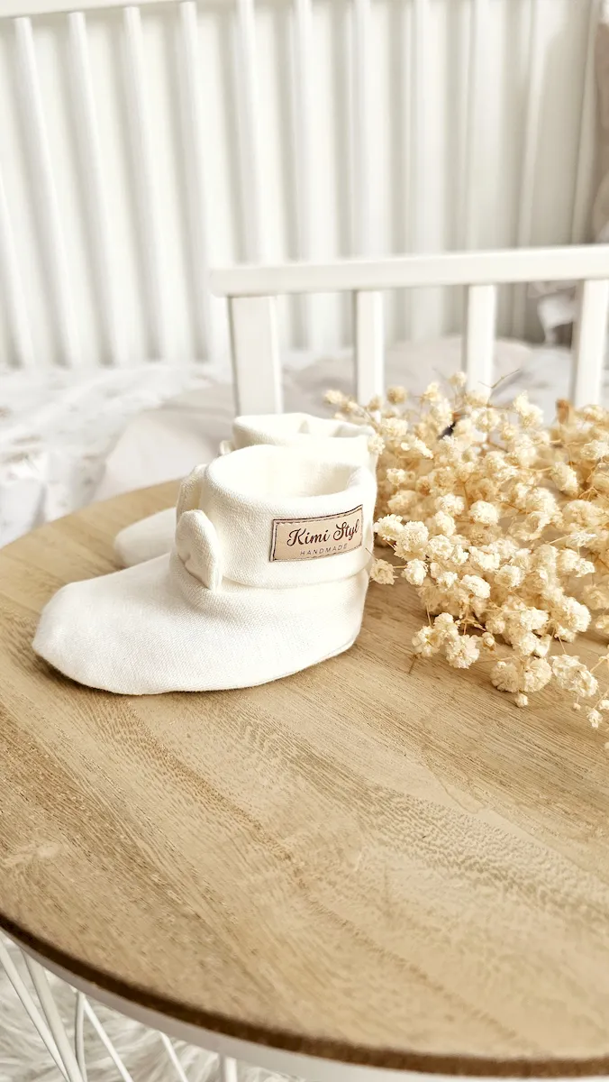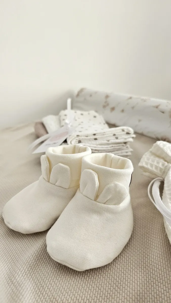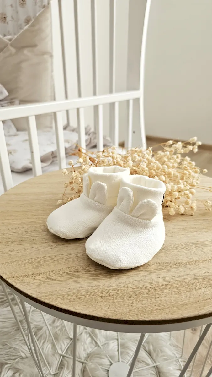 - Butki niechodki z uszkami – urocze buciki z miękkiej dzianiny bawełnianej z futerkiem w środku, idealne do otulenia małych stópek maluszka.