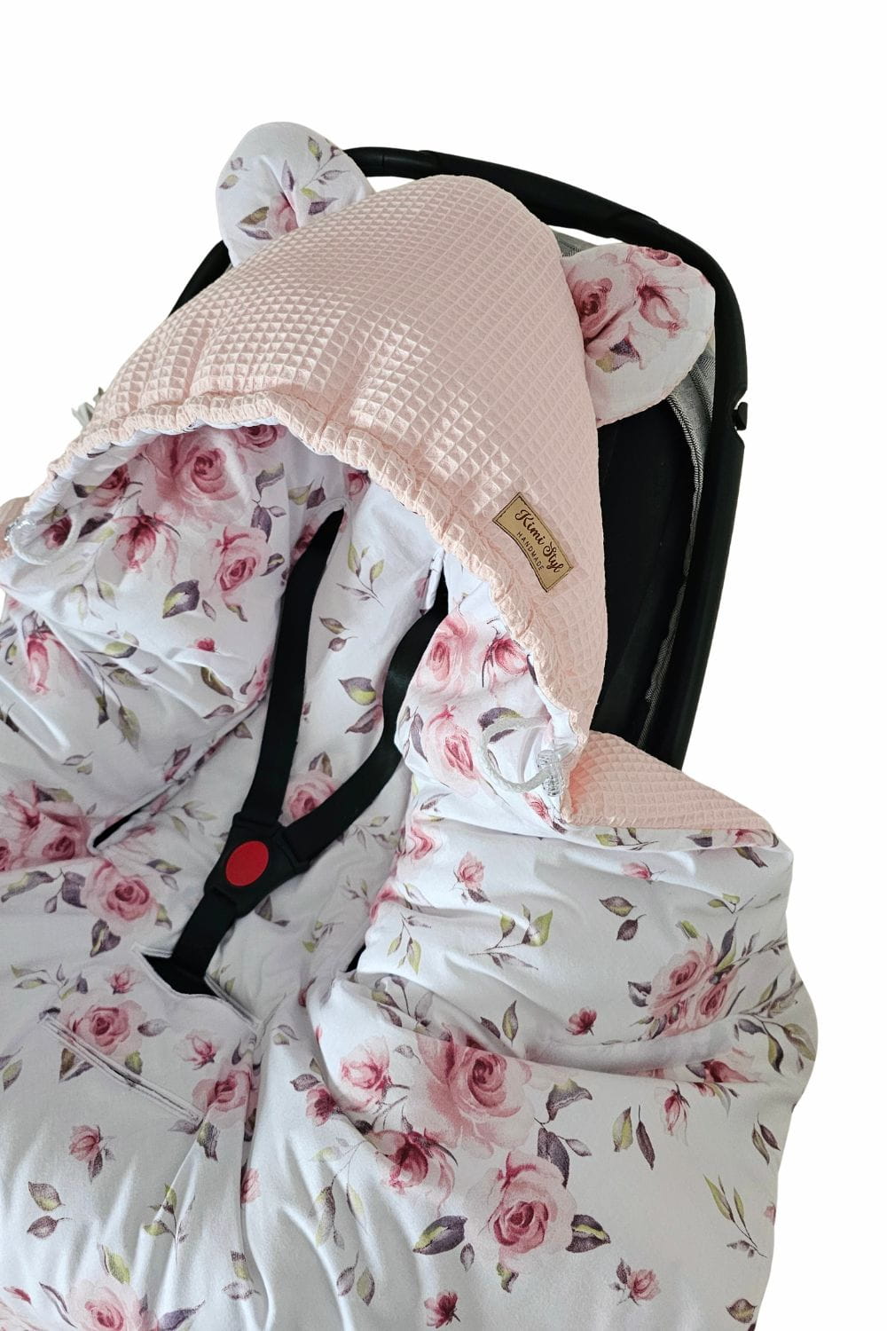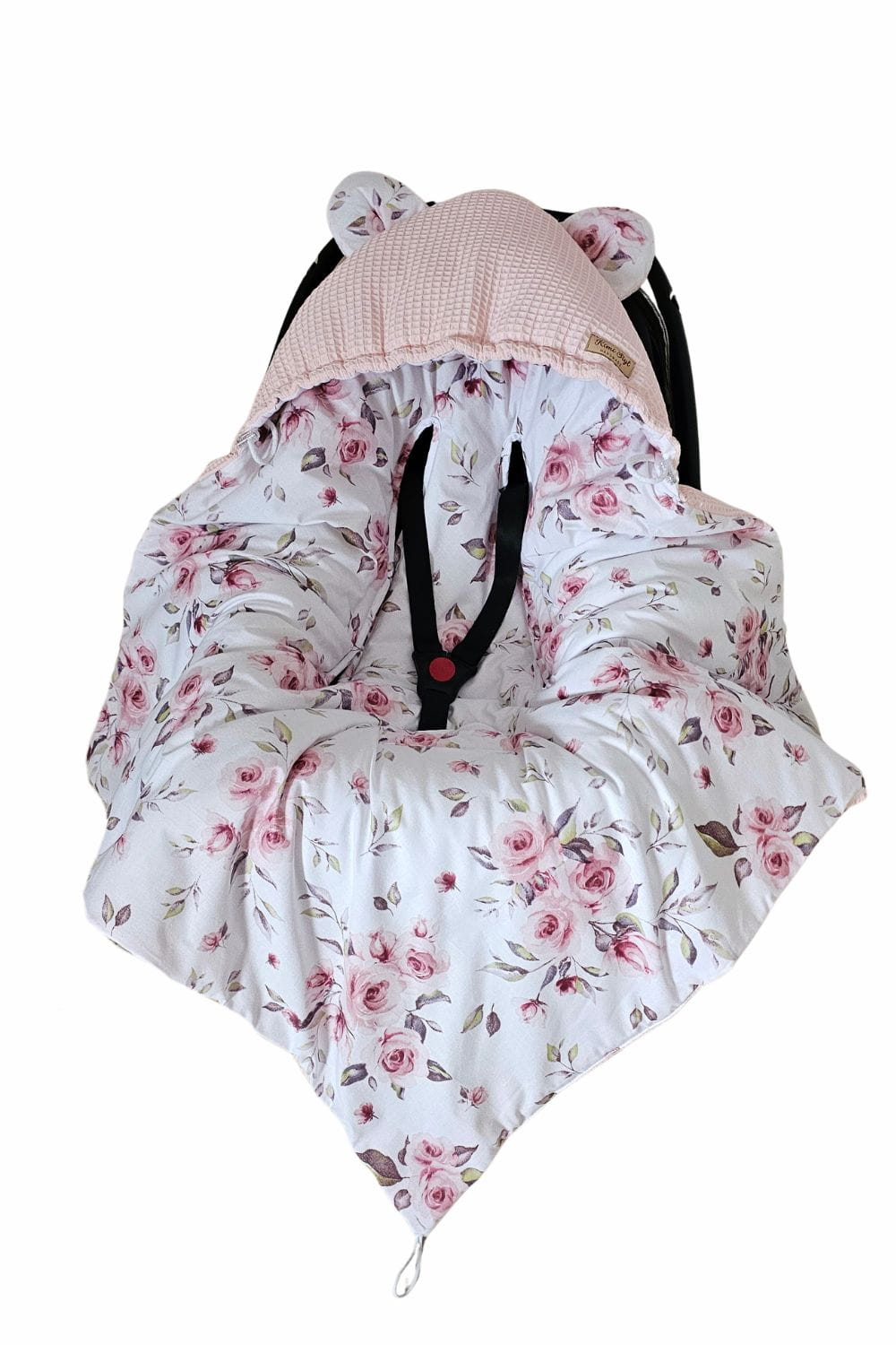 Kocyk WAFEL otulacz z KAPTURKIEM z uszami do nosidełka ROMANTYCZNE RÓŻE