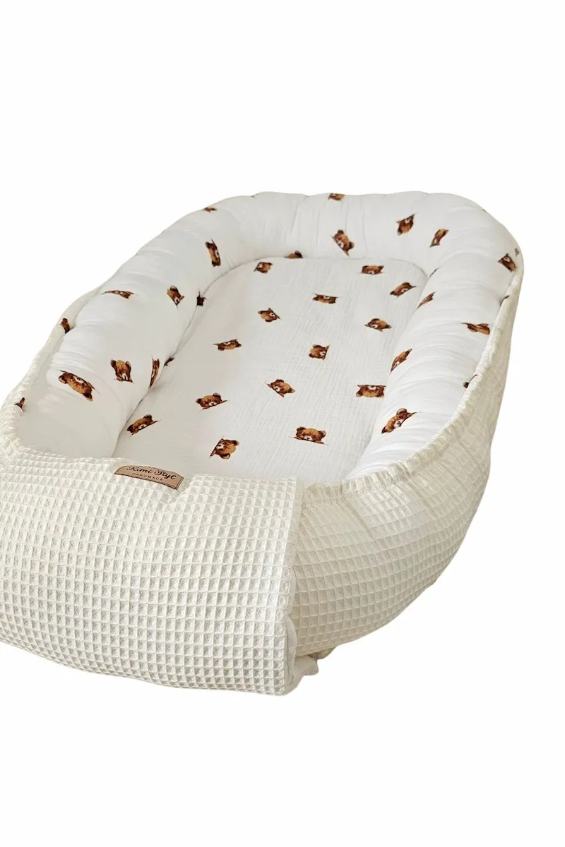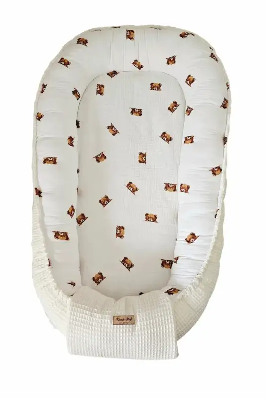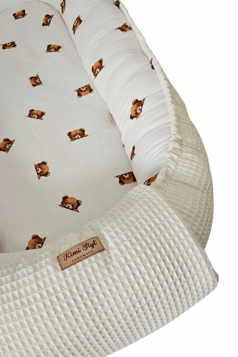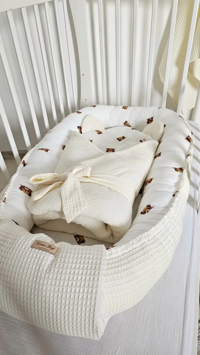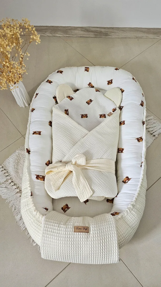 Ten kokon to połączenie dwóch światów — elegancji wafla i miękkości muślinu double gaze.
