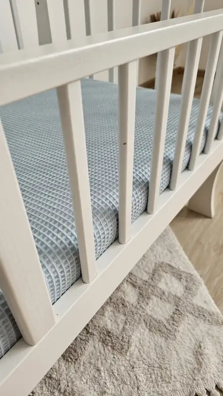 Delikatne i miękkie prześcieradło do łóżeczka, uszyte z wyjątkowej tkaniny wafel ze 100% bawełny, zapewnia komfortowy i spokojny sen każdemu maluszkowi. Struktura wafla sprawia, że materiał jest przewiewny, a jednocześnie przytulny i miły w dotyku. Wszyta gumka na całym obwodzie pozwala na idealne dopasowanie do materaca, zapobiegając przesuwaniu się prześcieradła.