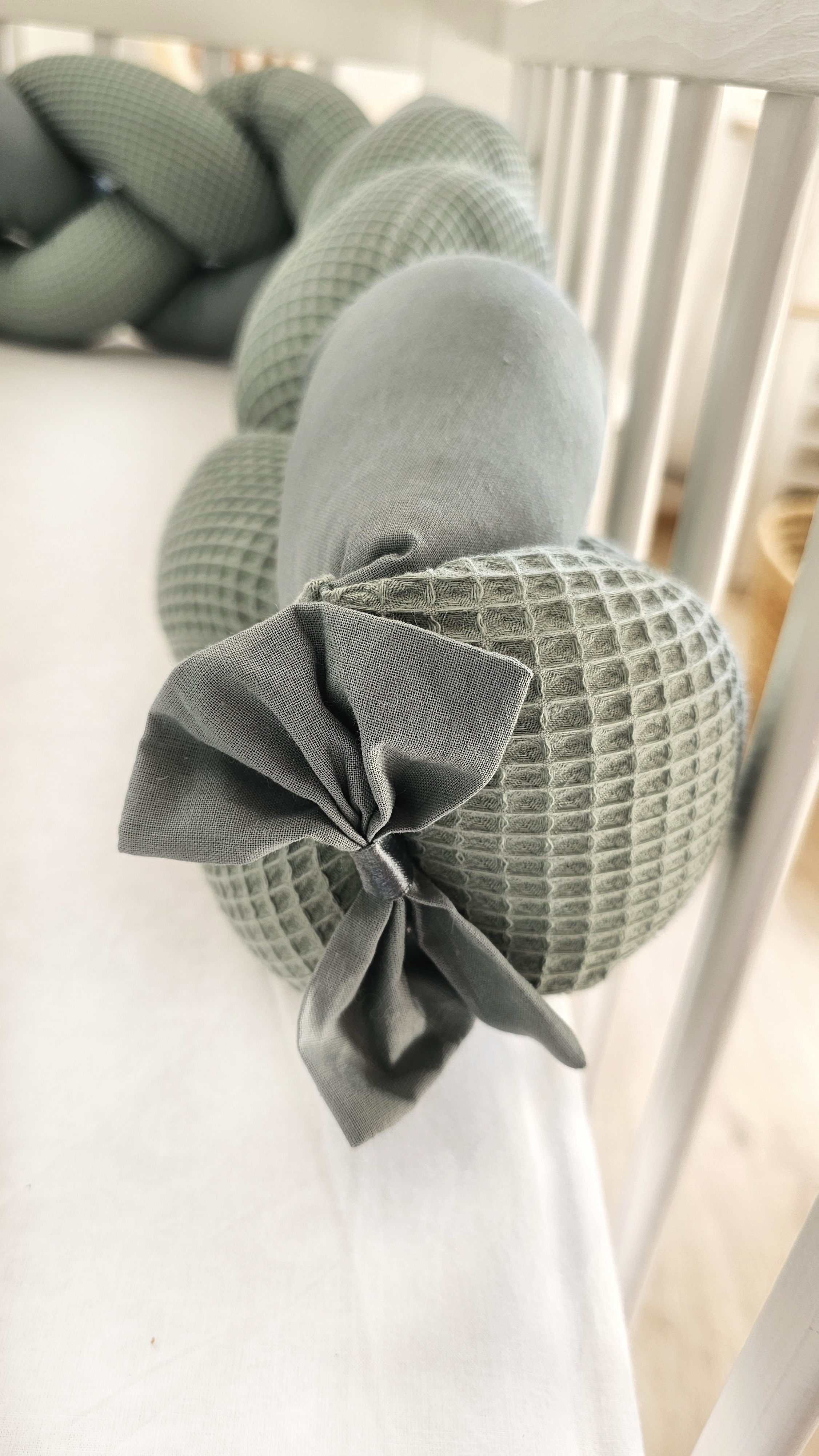 Warkocz montujemy przy pomocy tasiemki, dzięki której można przywiązać ochraniacz do szczebelków łóżeczka. Mamy pewność, że warkocz będzie leżał stabilnie a maluszek będzie czuł się komfortowo.