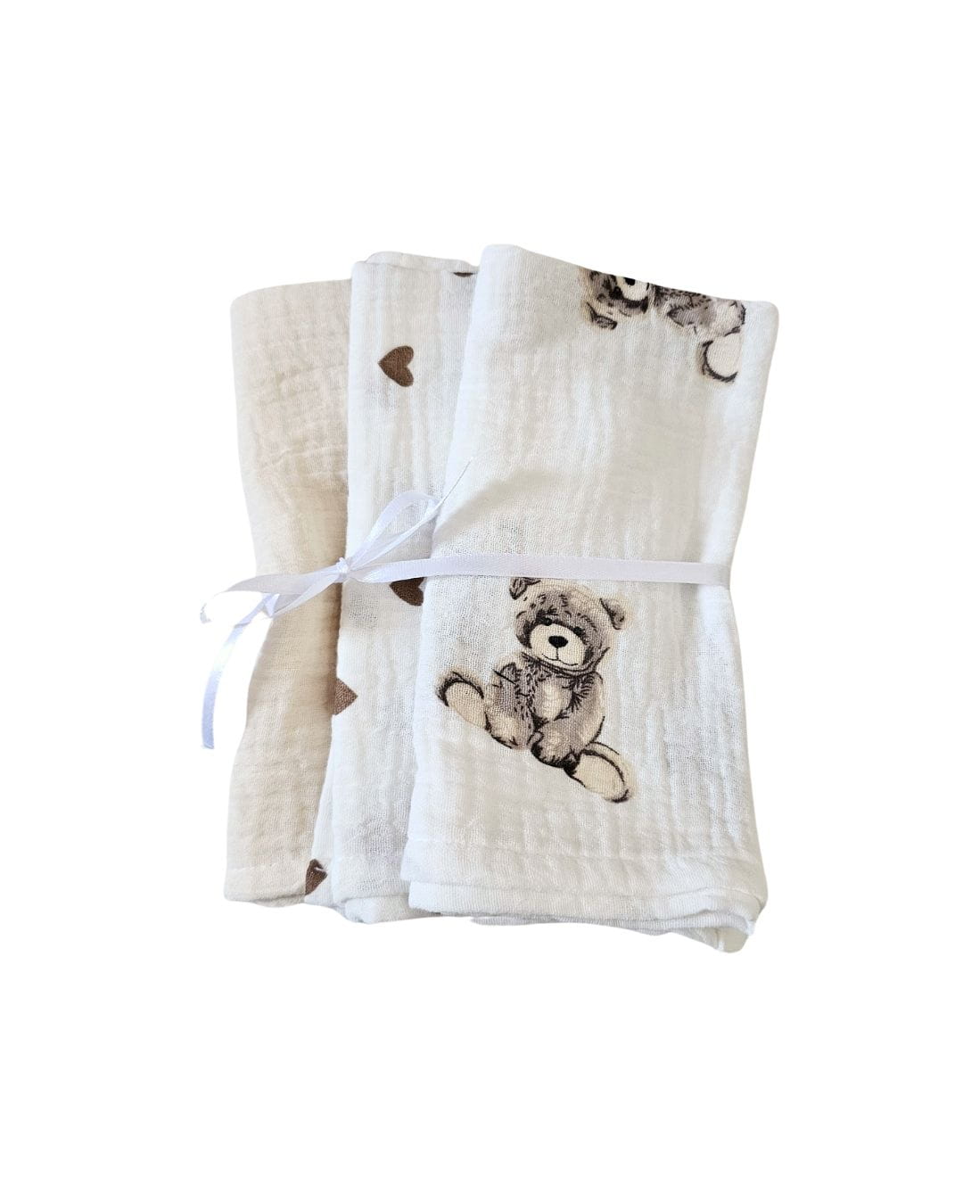 Pieluszka muślinowa ulewajka 3-pak beż-beżowe serca-misie