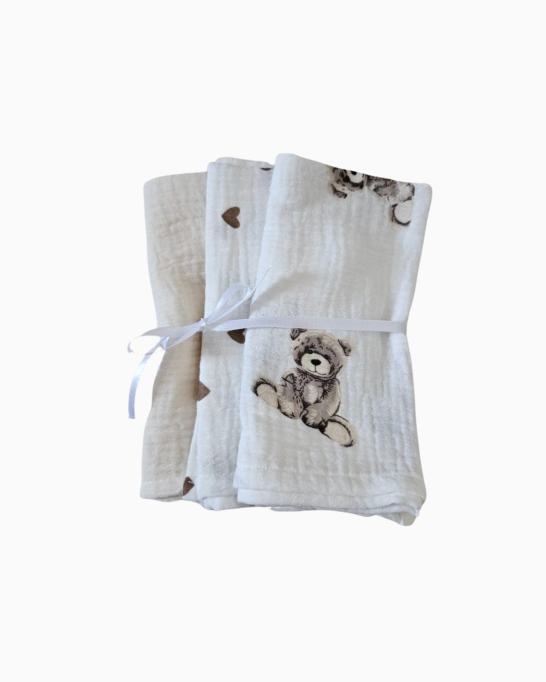 Pieluszka muślinowa ulewajka 3-pak jasny beż-beżowe serca-misie