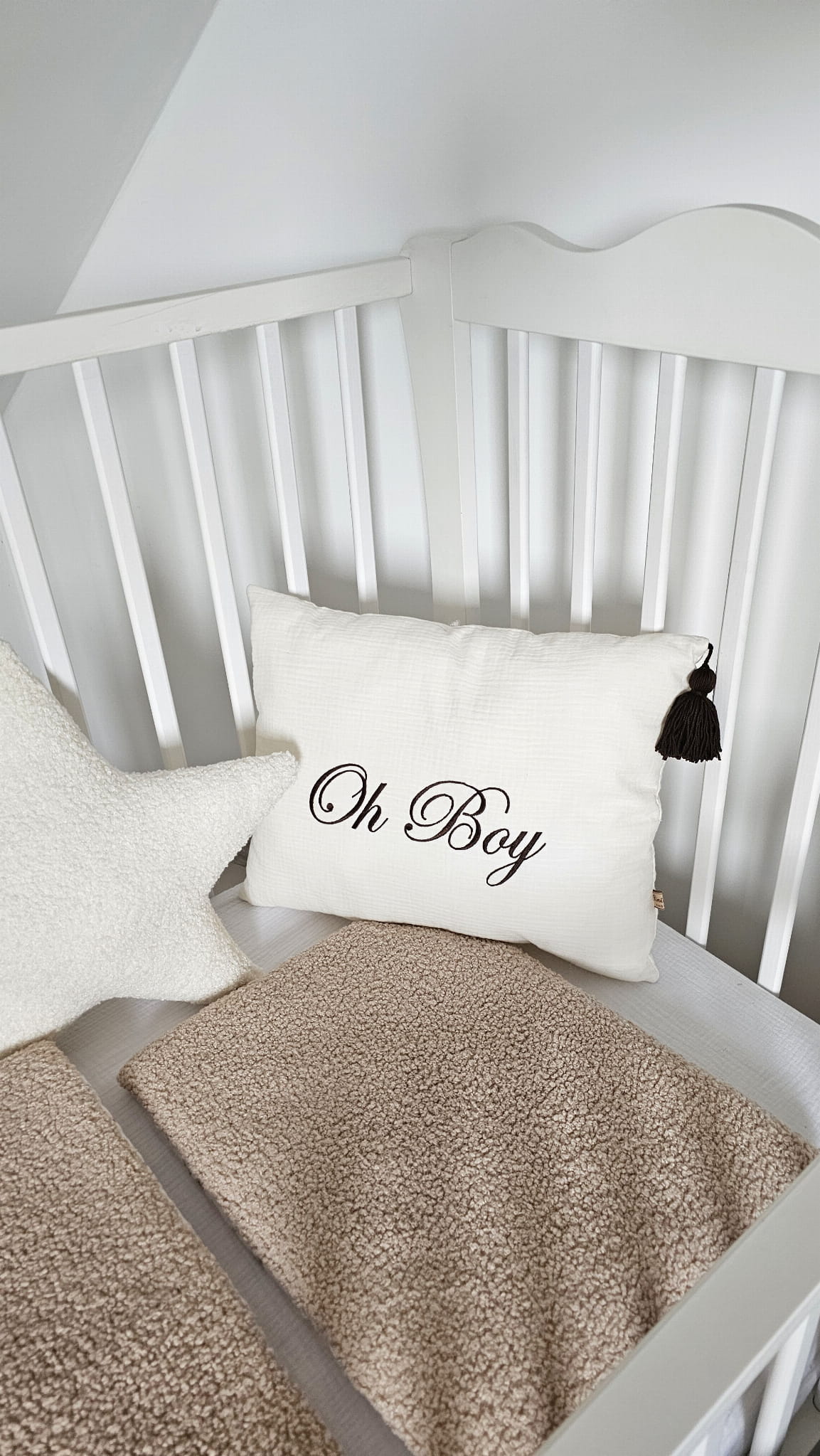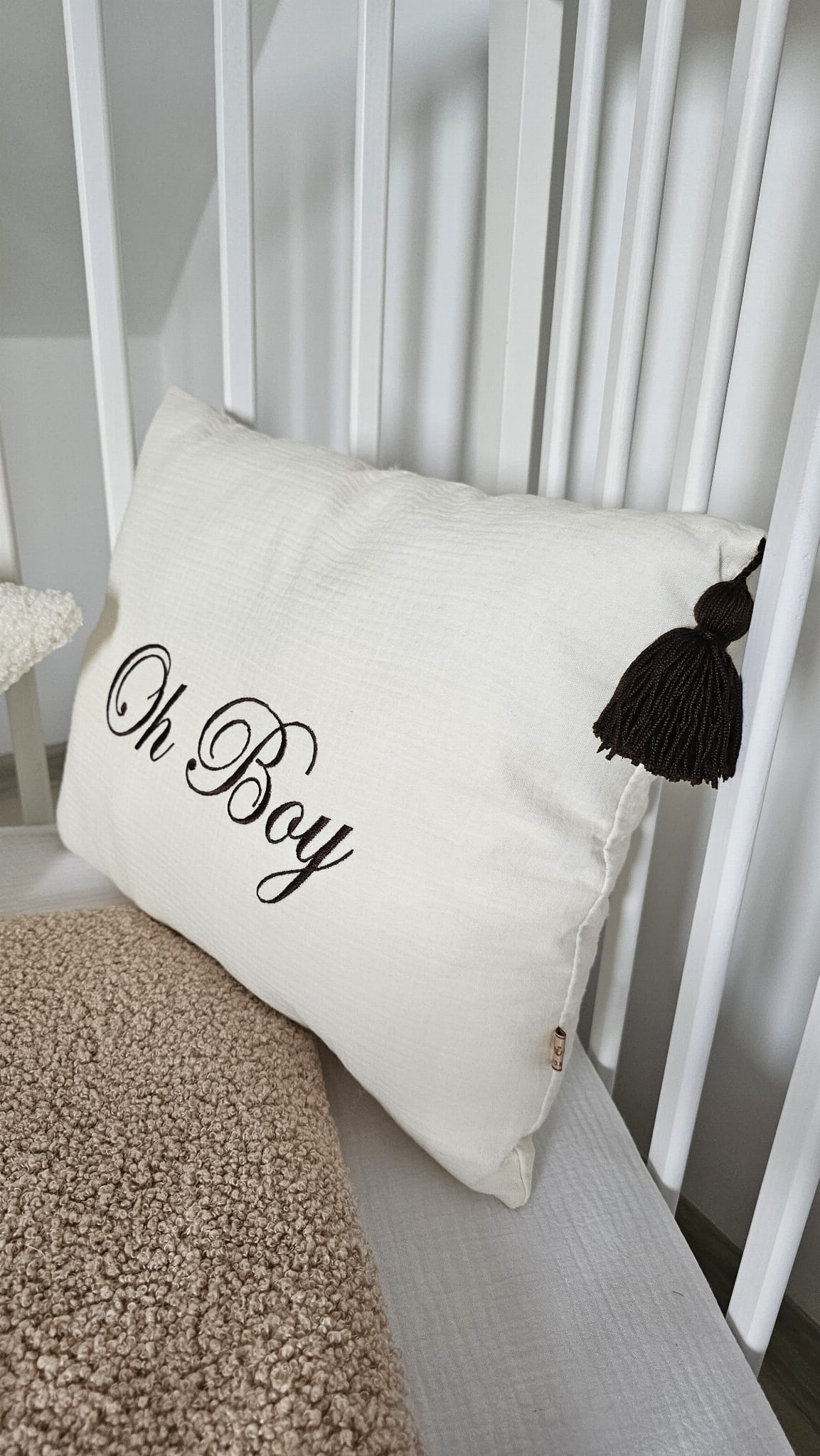 Poduszka dekoracyjna z muślinu śmietankowego z napisem oh boy i chwostem