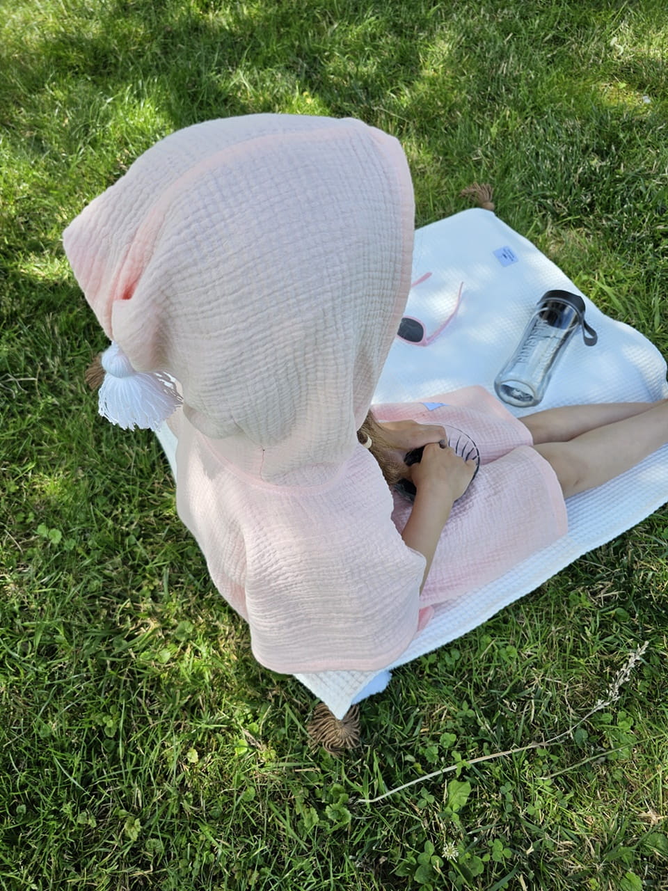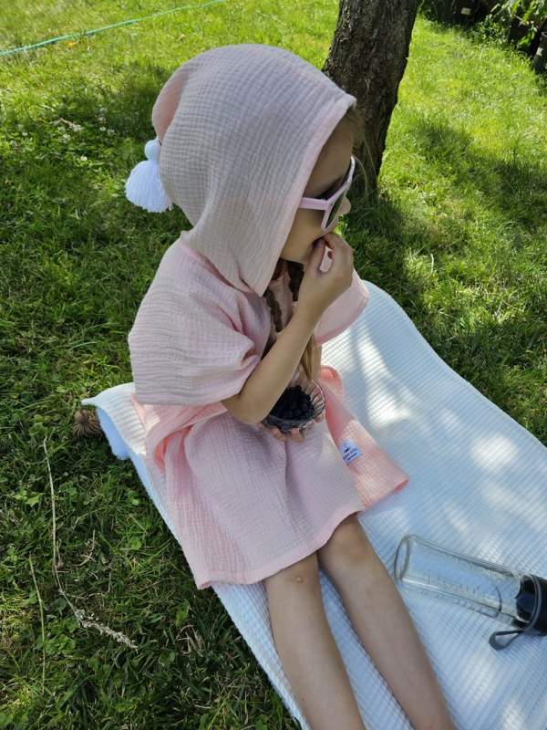 Właśnie dlatego stworzyliśmy ponczo muślinowe z kapturkiem i ozdobnym chwostem – miękkie, lekkie i wciągane przez głowę jak wygodna koszulka. Zero marudzenia. Zero odkrywania się.