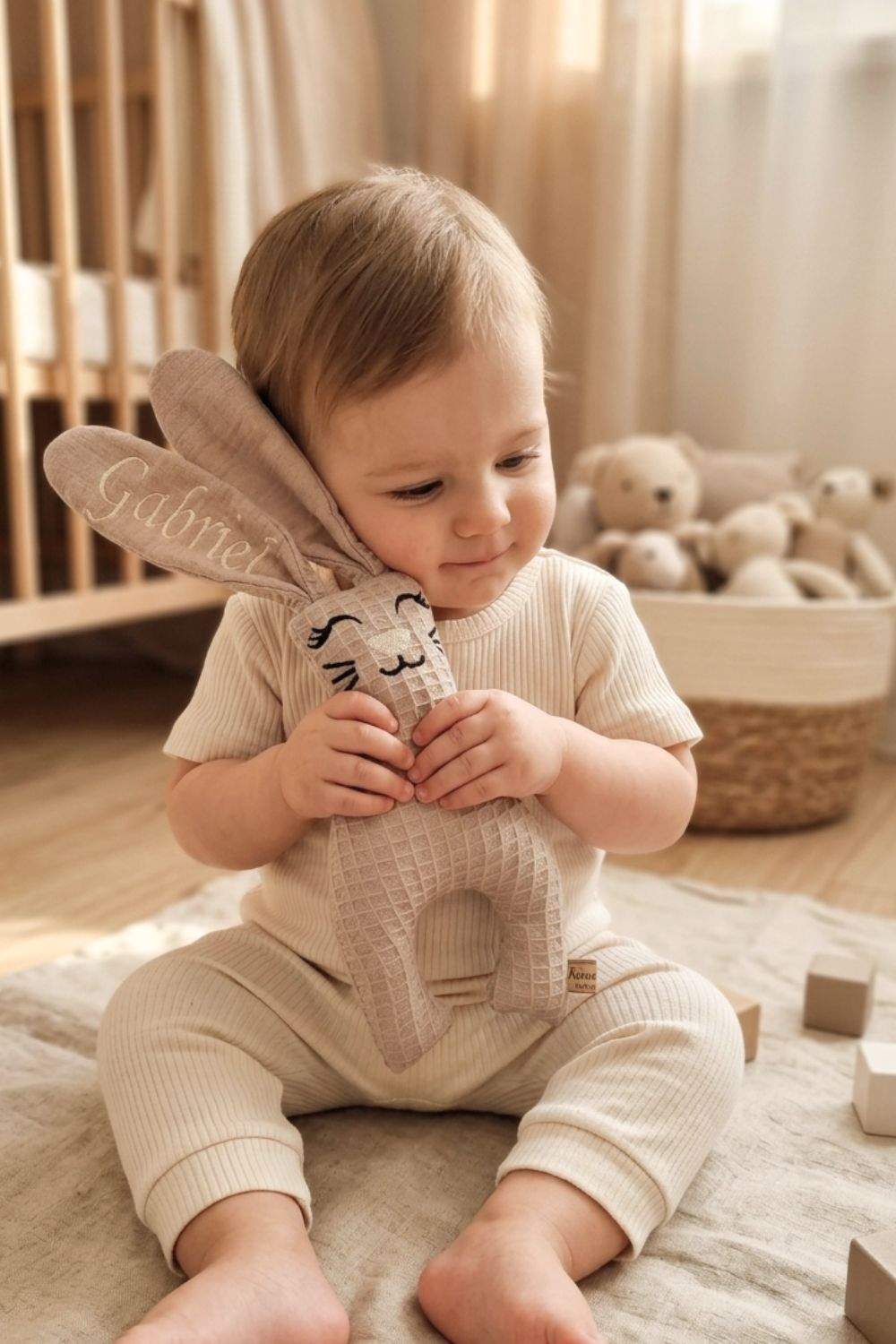 Naturalne materiały: Brzuszek królika to mięsisty, 100% wafel bawełniany, a wnętrze uszek to delikatny jak chmurka muślin bawełniany. Idealne zestawienie dla wrażliwej skóry noworodka.