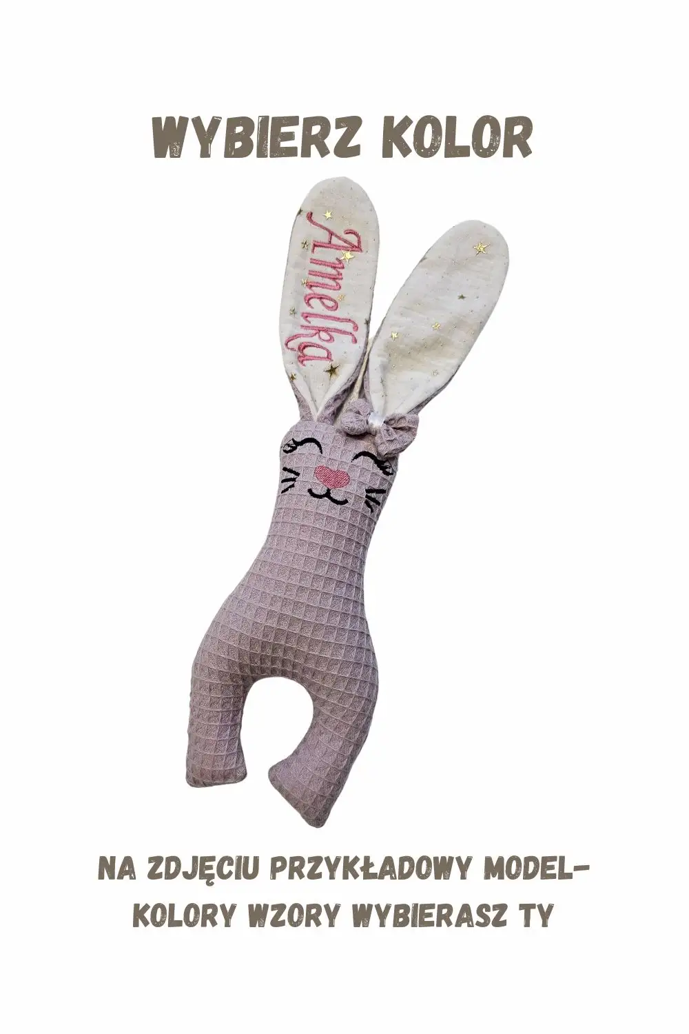 Personalizacja w cenie: Wyjątkowy prezent wymaga imienia! Wykonamy dla Ciebie haft na uchu lub brzuszku króliczka całkowicie za darmo. To Ty decydujesz, jak ma wyglądać ten jedyny w swoim rodzaju towarzysz.