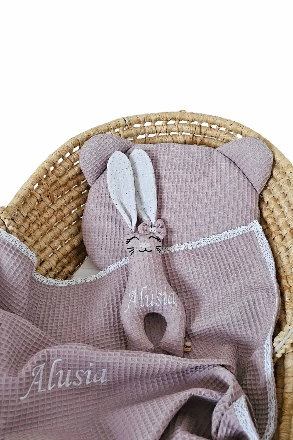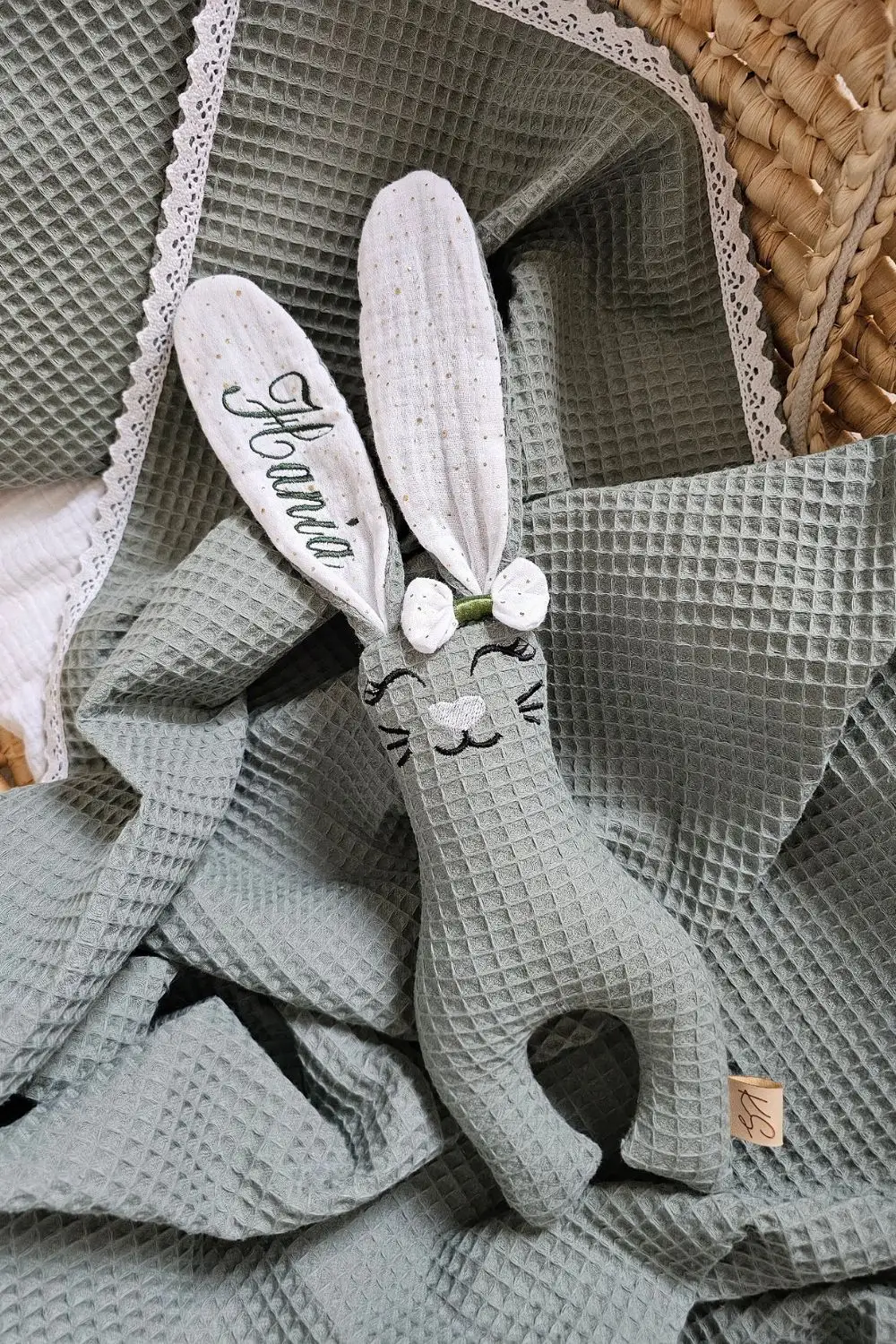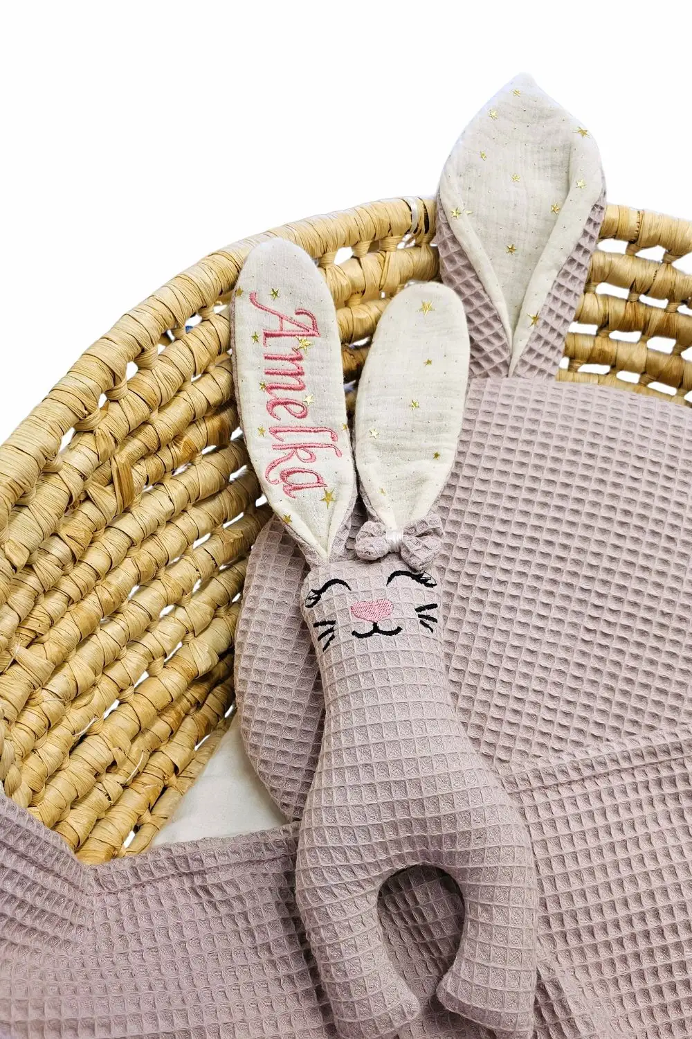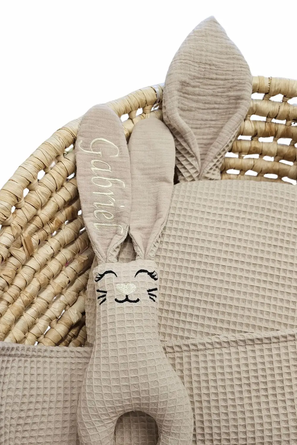 Naturalne materiały: Brzuszek królika to mięsisty, 100% wafel bawełniany, a wnętrze uszek to delikatny jak chmurka muślin bawełniany. Idealne zestawienie dla wrażliwej skóry noworodka.