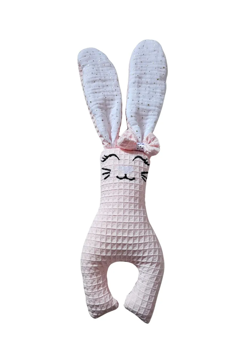 Naturalne materiały: Brzuszek królika to mięsisty, 100% wafel bawełniany, a wnętrze uszek to delikatny jak chmurka muślin bawełniany. Idealne zestawienie dla wrażliwej skóry noworodka.