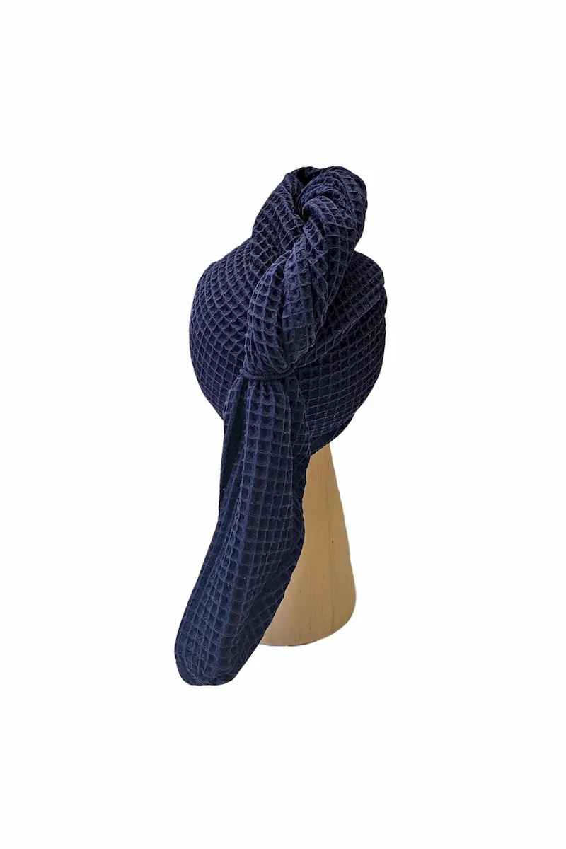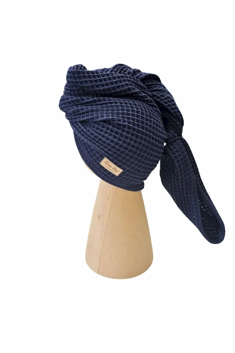 Dzięki zapięciu na gumkę turban pozostaje na miejscu, co eliminuje problem zsuwania się tradycyjnych ręczników. Lekki i oddychający materiał waflowy jest delikatny zarówno dla włosów, jak i skóry głowy.