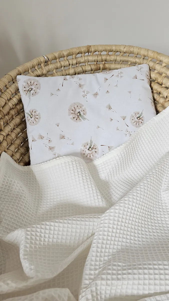 Zestaw kocyk wafelkowy z poduszką prostokątną DMUCHAWCE/ŚMIETANKA