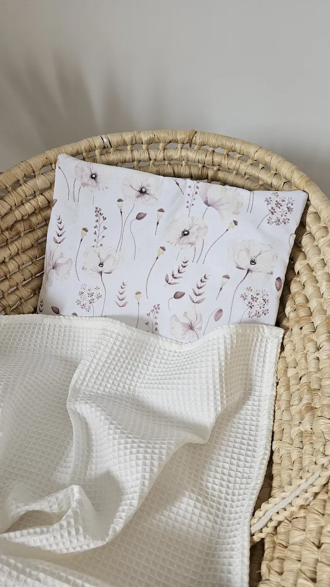 Zestaw kocyk wafelkowy z poduszką prostokątną PASTELOWE MAKI/ŚMIETANKA