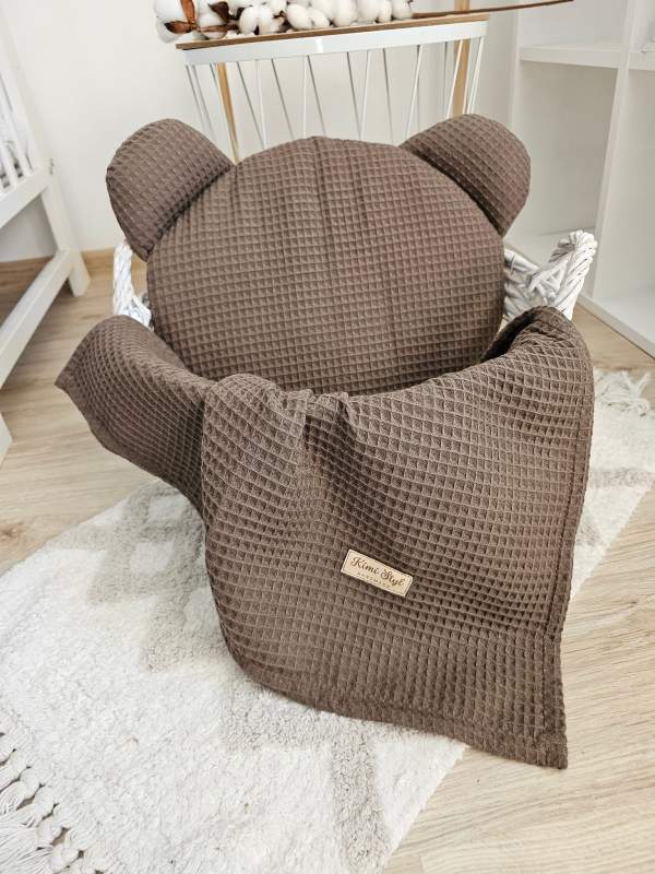 Zestaw otulacz kocyk wafelkowy z poduszką miś CZEKOLADA