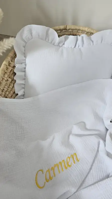 Podaruj swojemu maluszkowi komfort, delikatność i bezpieczeństwo dzięki wyjątkowemu zestawowi: otulacz muślinowy z białą koronką oraz urocza poduszka z falbanką. To must-have w każdej wyprawce!