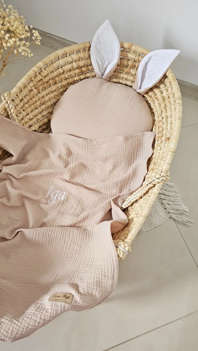 Podaruj swojemu maluszkowi komfort, delikatność i bezpieczeństwo dzięki wyjątkowemu zestawowi: otulacz muślinowy z ręcznie robionymi chwostami oraz urocza poduszka w kształcie króliczka. To must-have w każdej wyprawce!