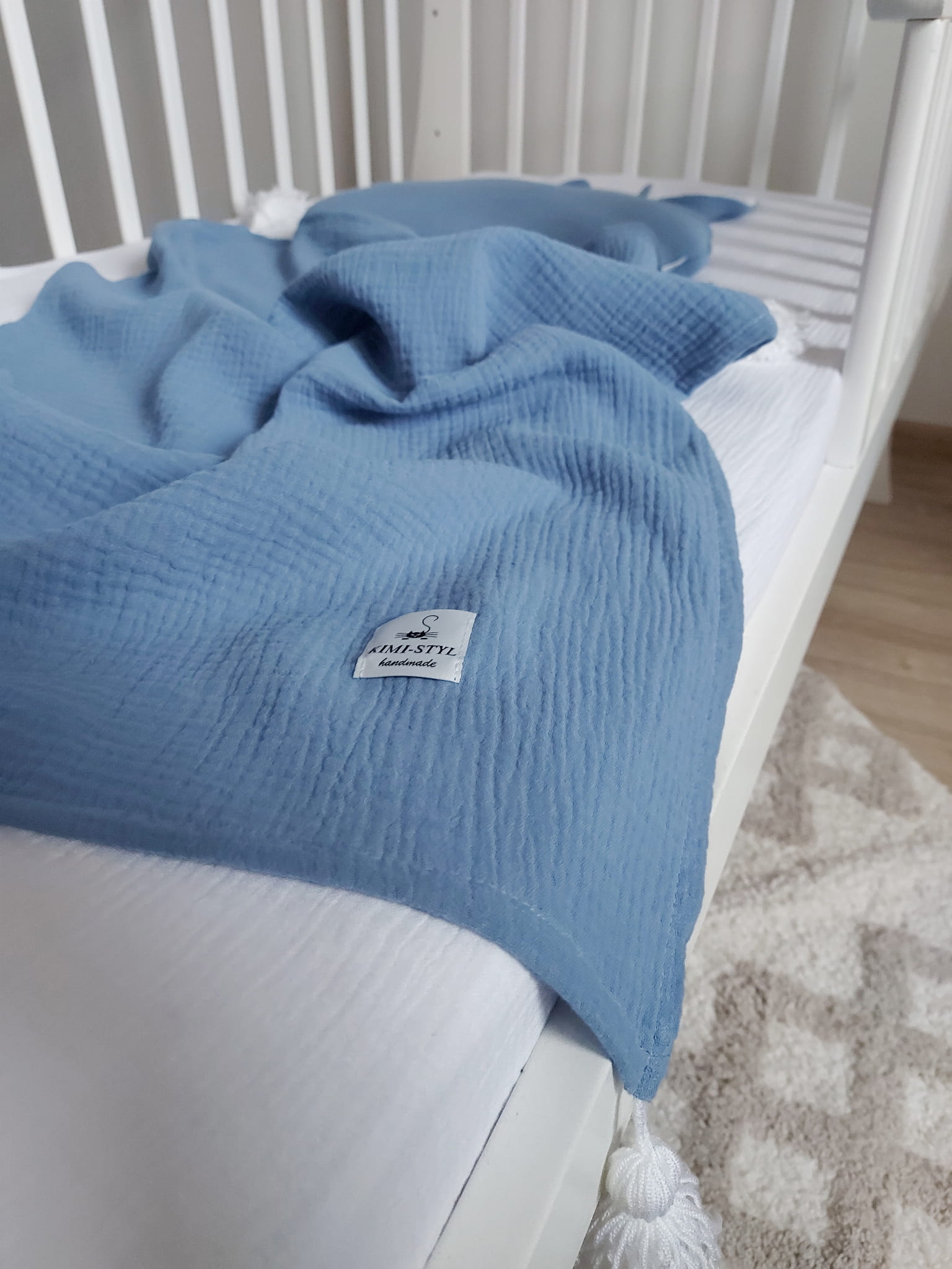 Otulacz został wykonany z najwyższej jakości muślinu, czyli marszczonej, kreszowanej bawełny, która jest niezwykle miękka i delikatna. Dzięki swoim właściwościom doskonale przepuszcza powietrze, pozwalając skórze oddychać i zapobiegając przegrzewaniu.