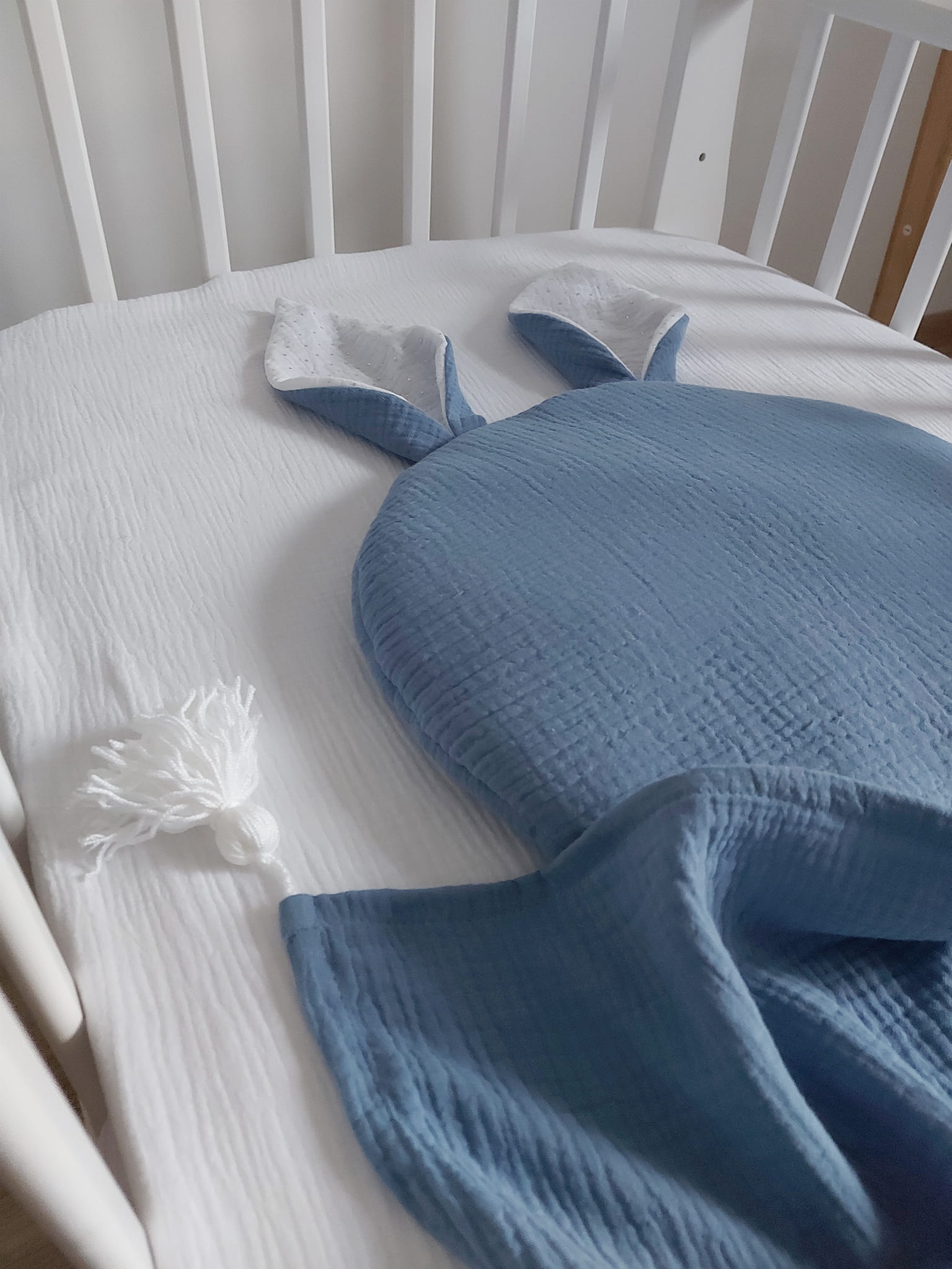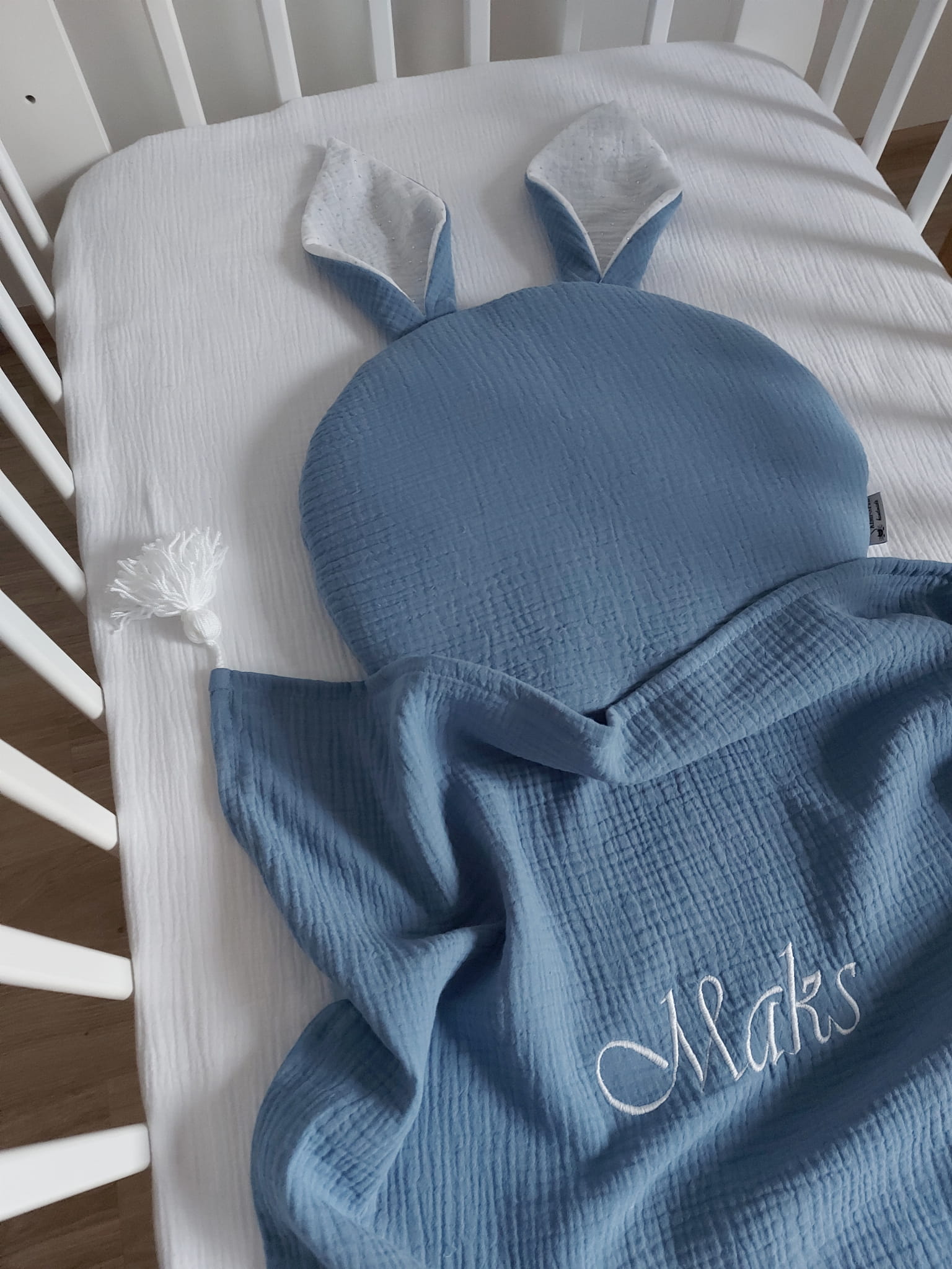 Zestaw otulacz muślinowy z chwostem + poduszka KRÓLIK JEANS