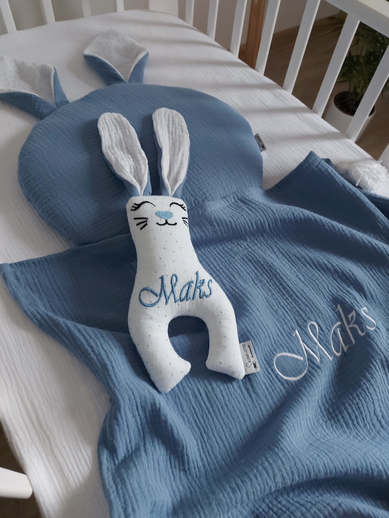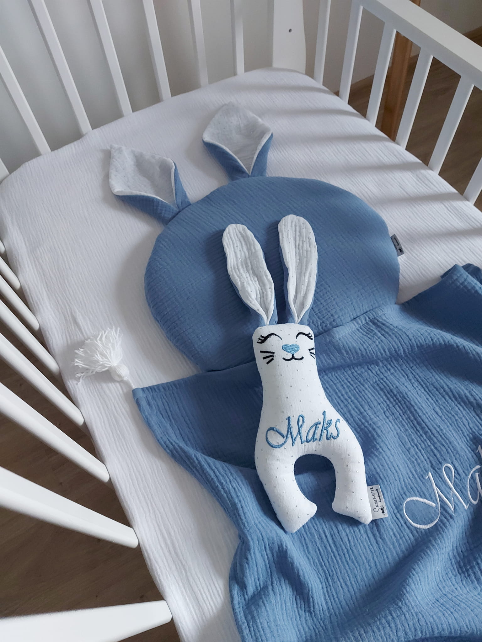 Zestaw otulacz muślinowy z koronką + poduszka KRÓLIK + Tuliś JEANS