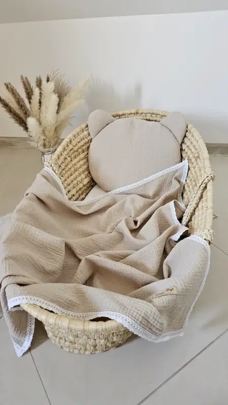 Zestaw otulacz muślinowy z koronką + poduszka MIŚ BEŻOWY